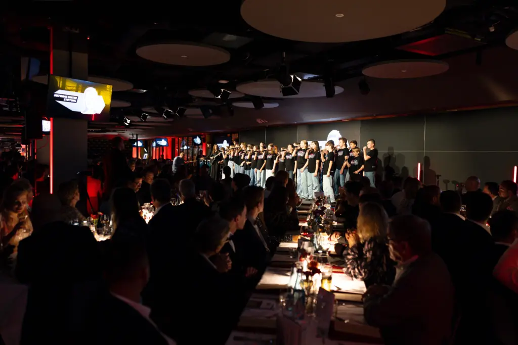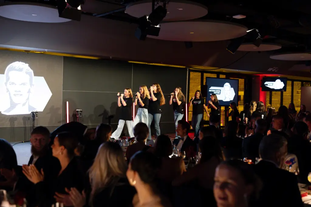 Vor beeindruckender Kulisse im VIP Bereich des SC Freiburg Stadions präsentierte die Klasse gleich zwei bekannte Songs. Mit viel Energie und Bühnenpräsenz begeisterten sie das Publikum mit „Sweet Dreams“ sowie „Bye Bye“ von Cro. Wochenlang hatten die Schülerinnen und Schüler geprobt, und der Einsatz zahlte sich sichtbar aus: Der Auftritt wurde mit begeistertem Applaus belohnt.